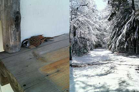 でも、哀れ。編集室の出入り口の脇にある、いつもお日様の看板を掛けておくスタンプ台に、雀が一羽死んでいました。かすかな窪みに頭を押しつけるように。どうしたのでしょう、寒さに凍えたのでしょうか。可哀想なので、埋めてやりました。どこに?この続きは、春になったらまたお話し致しましょう。