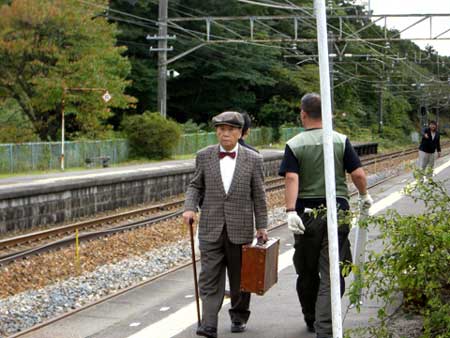 初日、上田電鉄「別所温泉駅」の写真の前で