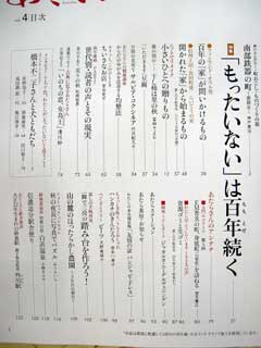 皆さま、信濃追分の山荘で花の絵を描き続けてらっしゃる「橋本不二子」さんをご存知でしょうか? 美しい花の絵もさることながら、本邦初公開!?不二子さんの描いた犬のパステル画には、スタッフ一同感嘆の声。繊細なタッチ、哀愁をこめたワンちゃんの瞳、9枚の肖像画は必見です。「特集・もったいないは百年続く」では、フィンランドの人気家具デザイナー・ミコラさんの家と、信州上田・真田町の「らいてうの家」の物語。美しい家や家具の写真と珠玉の言葉が満載です。